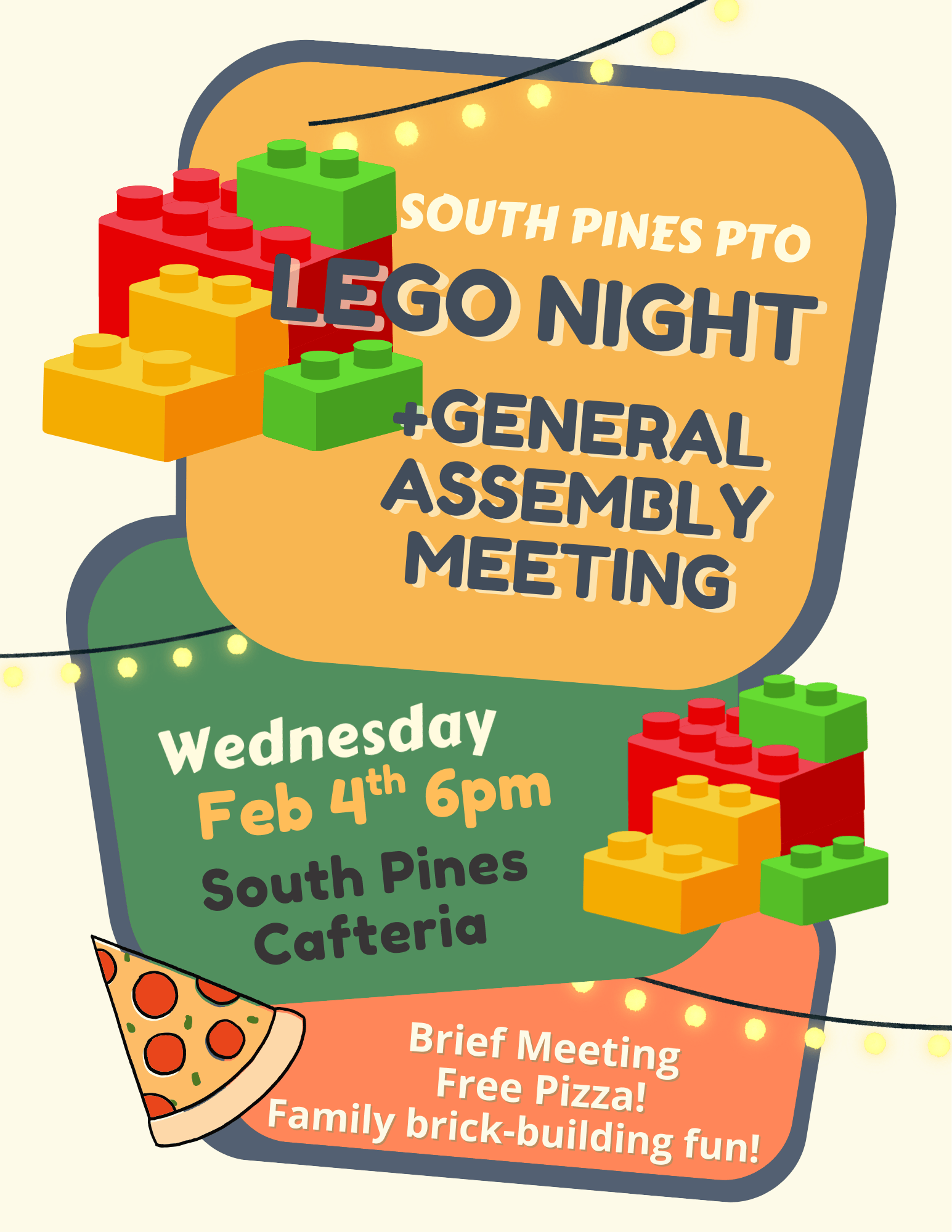 Brief PTO meeting, Free Pizza, Family Brick-building fun