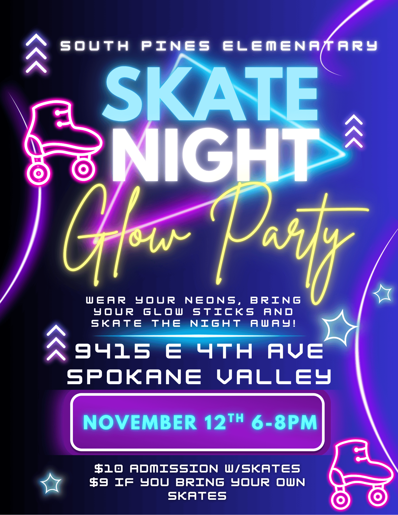 Skate Night Glow Party! Wear your neons, bring your glow sticks and skate the night away! $10 admission w/skates $9 if you bring your own skates 20% of sales...