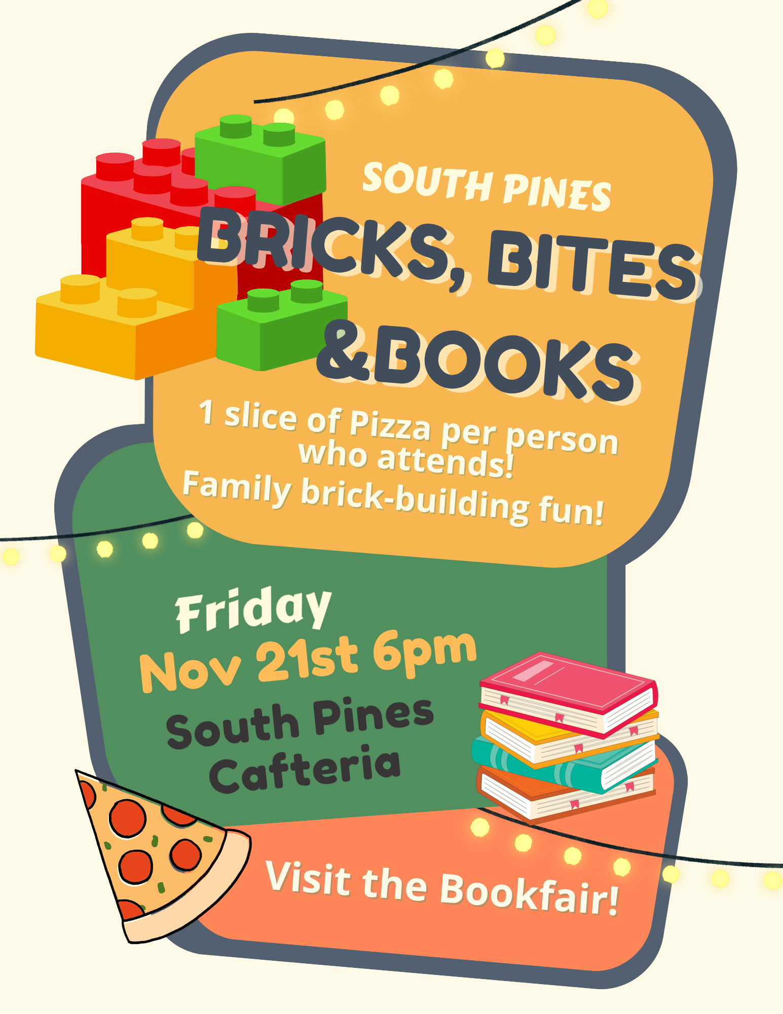Family Brick Building fun! 1 slice of Pizza per attendee! Visit the Bookfair!